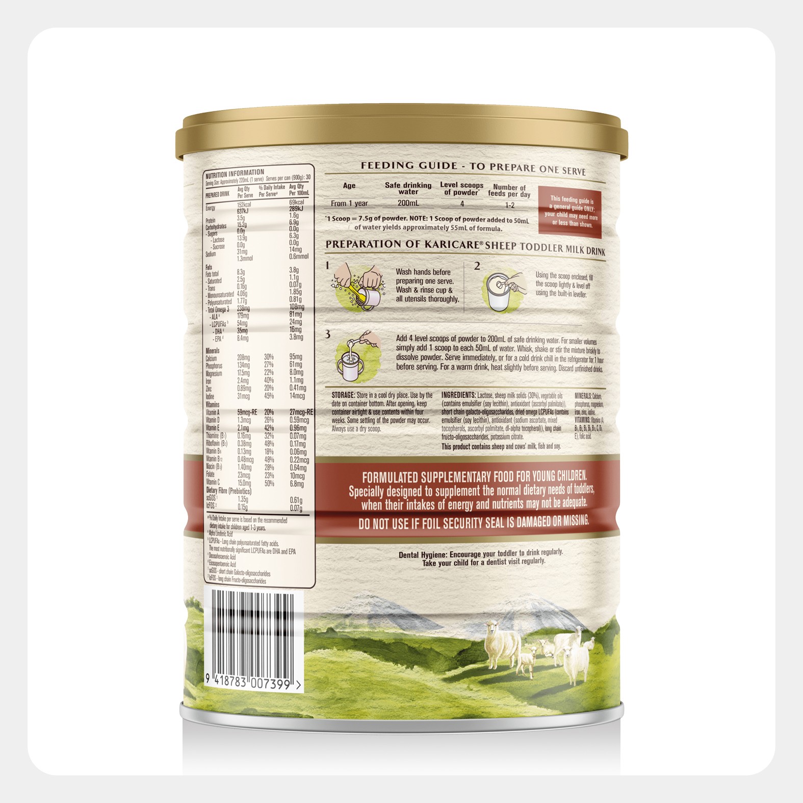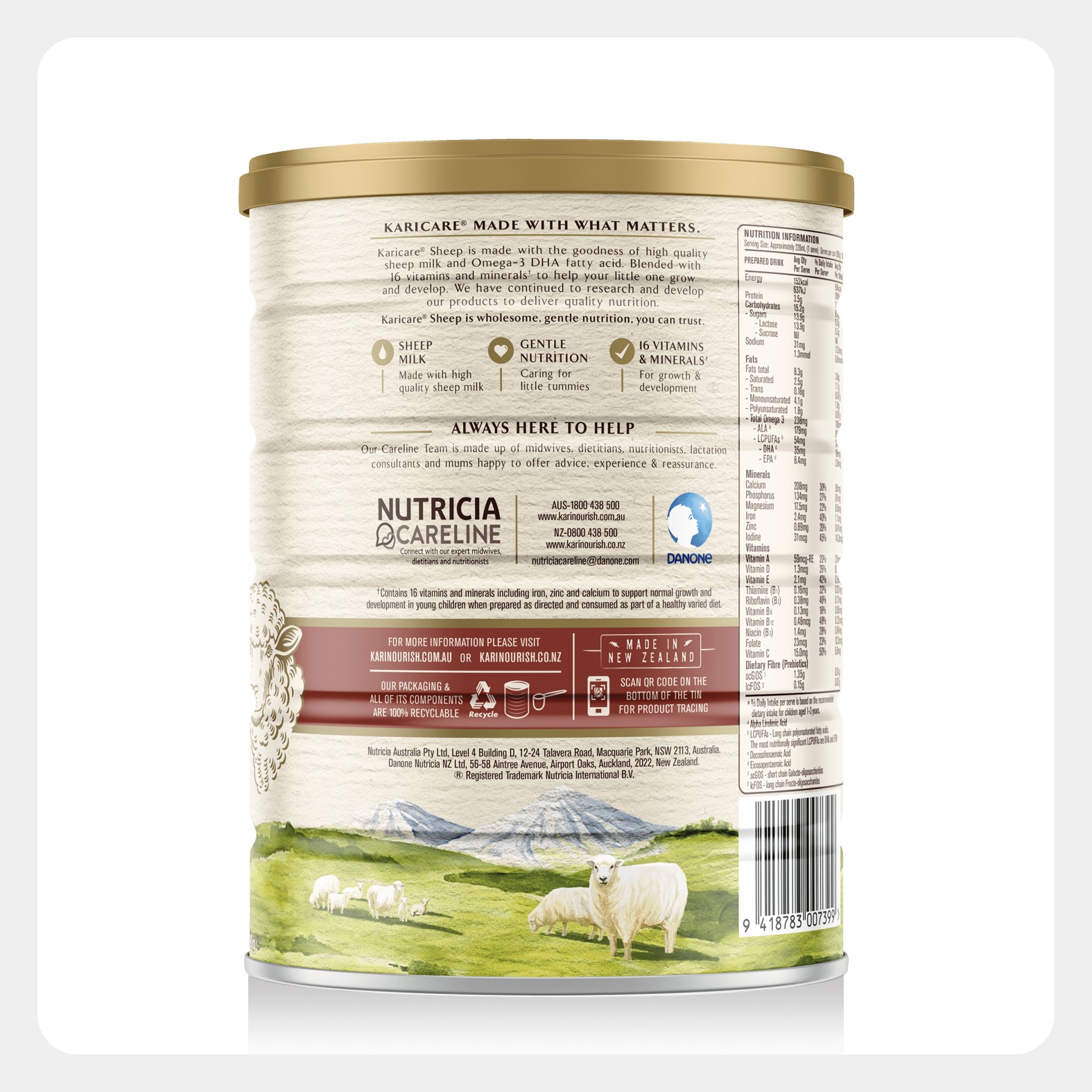 Karicare Toddler sheep Milk Drink Stage 3 is made with the goodness of high-quality sheep milk and Omega 3 DHA. Blended with 16 vitamins and minerals, including Calcium and Vitamin D to help your little one grow and develop normally*. Specially designed to supplement the normal dietary needs of toddlers, when their intake of energy and nutrients may not be adequate.*When prepared as directed and consumed as part of a healthy and varied diet.